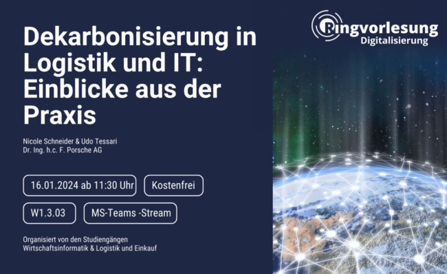 Hochschule Pforzheim, 16.01.2024 – Im Rahmen der Ringvorlesung Digitalisierung an der Hochschule Pforzheim fand am 16. Januar 2024 ein fesselnder Vortrag zum Thema “Dekarbonisierung in Logistik und IT” statt. Die…