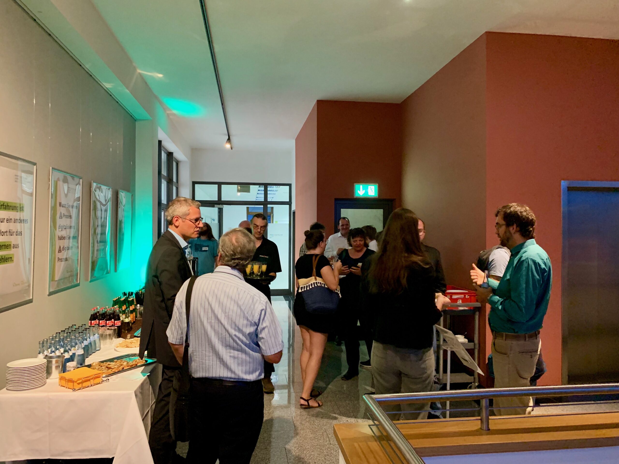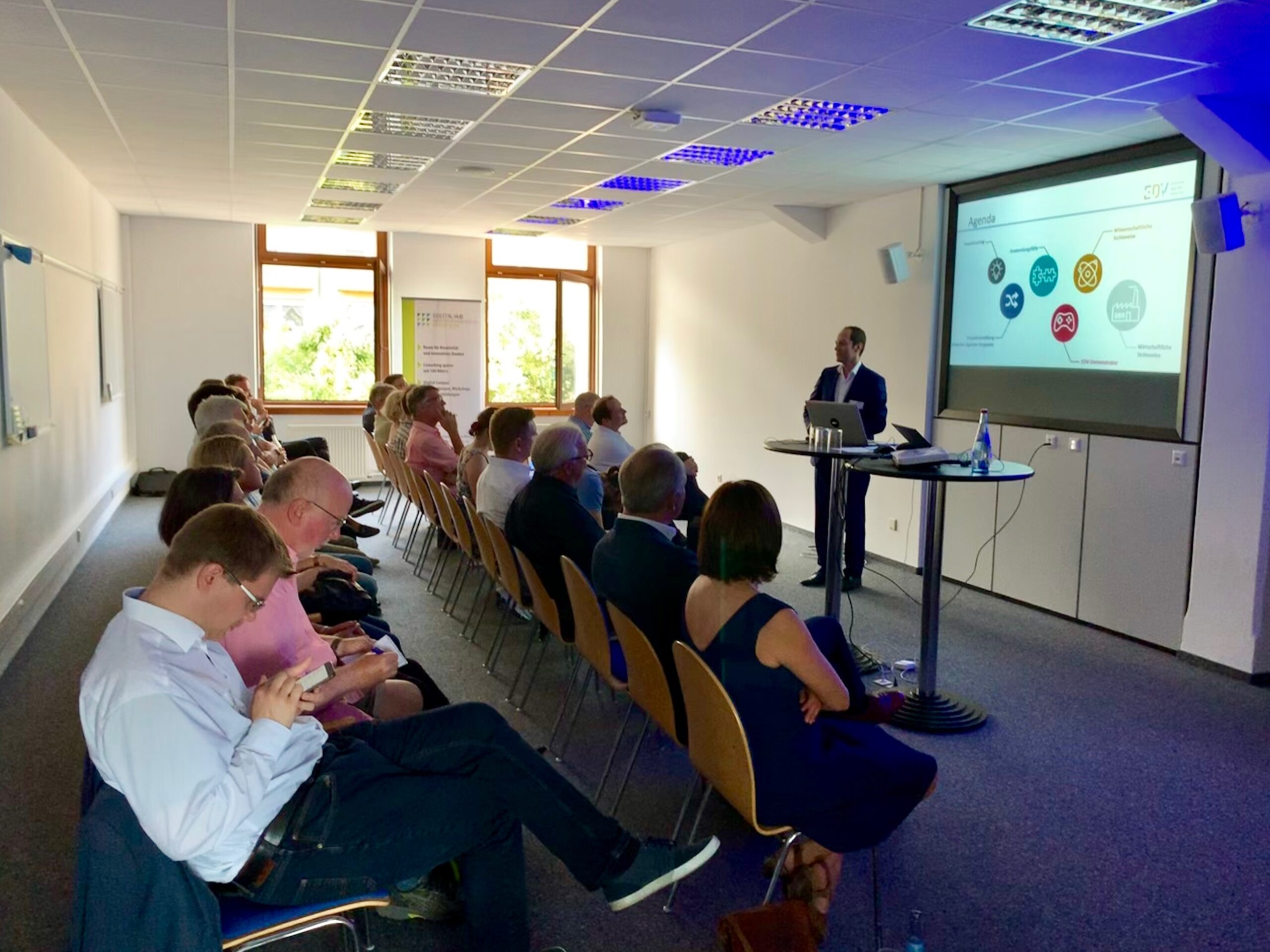 Zum Projektabschluss wurden die Forschungsergebnisse am 28.August 2019 im Digital Hub Pforzheim/Enzkreis im Rahmen einer Abschlussveranstaltung der Öffentlichkeit präsentiert. Circa 40 Teilnehmer folgten der Einladung und nahmen am kostenlosen Event teil, um sich über die EDV-Projektergebnisse informieren zu lassen. Das facettenreiche Rahmenprogramm beinhaltete verschiedene Vorträge. Eröffnet wurde die Veranstaltung von Markus Meser, der den Digital Hub Pforzheim/Enzkreis leitet, ehe Konsortialführer Mario Herb von der esentri AG das Publikum begrüßte. Klaus Brisch, Fachanwalt für Informationstechnologie ermöglichte den Besuchern interessante Einblicke in die Herausforderungen der Datenschutz-Grundverordnung (DSGVO) und gab einen allgemeinen Überblick über das Datenschutzrecht. Mario Herb setzte auf diesen Herausforderungen auf und nutze die Chance, um das EDV-Projekt vorzustellen. Antonia Schwichtenberg von der CAS Software AG gab den Zuschauen Einblicke potenzieller Anwendungsgebiete der EDV-Software. Mittels einer Live-Demonstration konnten Christoph Beckmann, ebenfalls von der CAS Software AG sowie Mario Herb den Zuschauern die Funktionsweise des EDV-Prototypen veranschaulichen. Aber auch die wissenschaftliche Sichtweise wurde berücksichtigt. Wasilij Beskorovajnov vom FZI gab Einblicke in IT-Sicherheit indem er verschiedene Verschlüsselungstechnologien präsentierte. Prof. Dr. Thomas Schuster, der die Veranstaltung zudem moderierte erläuterte im Anschluss das im EDV-Projekt verwendete Multiplattform-Konzept, das die Entwicklung verschiedener Client-Anwendungen ermöglicht. Bevor sich die Teilnehmer am Buffet stärken konnten, zeigten abermals Mario Herb und Antonia Schwichtenberg die wirtschaftliche Verwertungsperspektive auf. Aus den Vorträgen entstanden spannende und kontroverse Diskussionen zwischen Vortragenden und den Teilnehmern -ein voller Erfolg für das EDV-Projektteam und ein gelungener Projektabschluss!