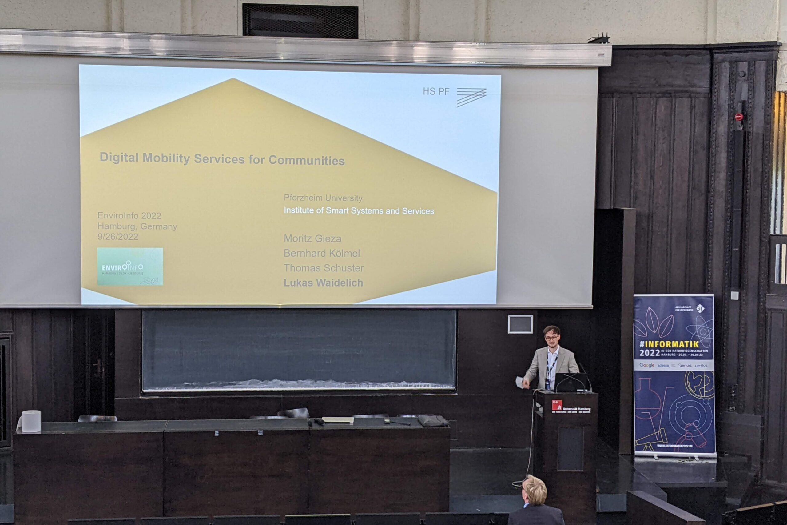 Im Rahmen der vom 26. bis 28. September 2022 in Hamburg stattfinden ENVIROINFO-Konferenz präsentierte Lukas Waidelich stellvertretend für die Autorenschaft um Prof. Dr. Thomas Schuster, Prof. Dr. Bernhard Kölmel und Moritz Gieza ein Forschungspapier zu den Arbeiten an der Hochschule-Ridesharing App.