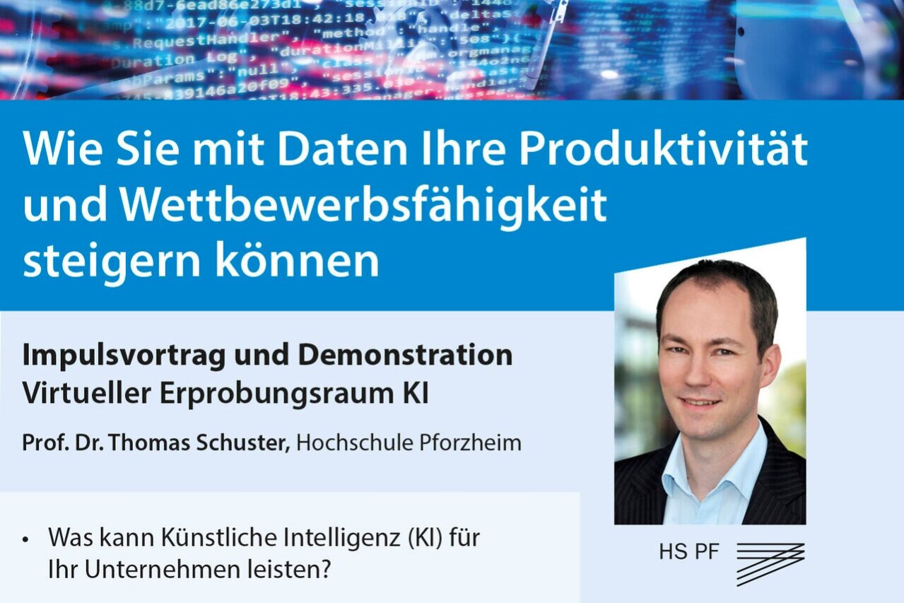 Jeder hat davon gehört und kommt damit in Berührung. Es wird höchste Zeit über Künstliche Intelligenz zu sprechen: Prof. Dr. Thomas Schuster nimmt euch am 15.12.2022 zwischen 13 Uhr und 14 Uhr mit auf eine Reise und stellt den virtuellen Erprobungsraum des KI-Lab Nordschwarzwald vor. Dabei beschäftigt er sich vor allem mit Datenmengen – wie sie zur Produktivität beitragen und die Wettbewerbsfähigkeit steigern.